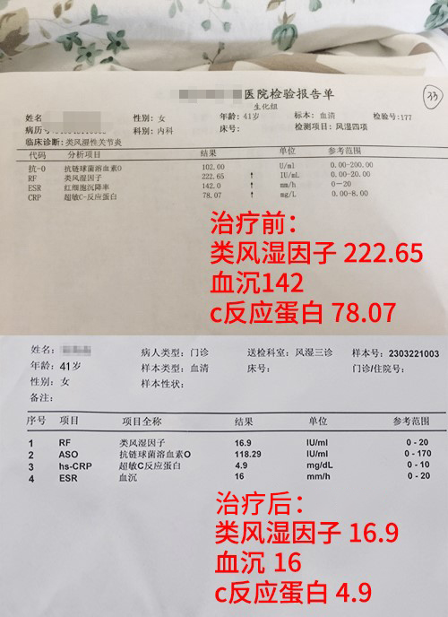 在得知主任专门研究类风湿很多年,一直以来最喜欢研究别的医院看不好的类风湿。这使他看到了希望,一口气找主任开了二个疗程的药, 只吃了十来天就发现关节肿胀疼痛好多了,睡眠质量也比以前高多了,二个疗程下来,几乎没有什么症状了。